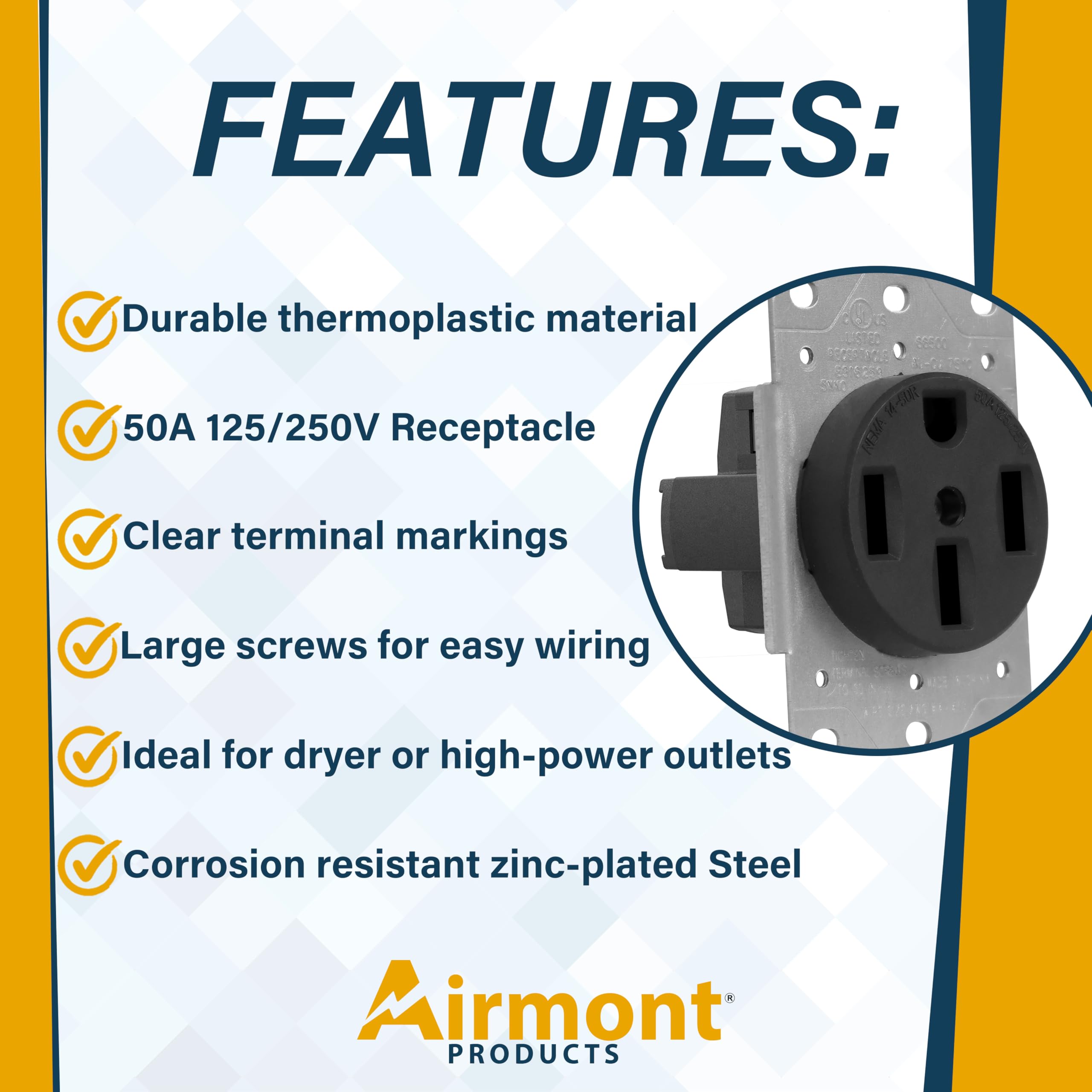 Airmont Products NEMA 14-50 Kit – Complete 50 Amp Receptacle Outlet Solution for EV Charging, Dryers, RVs, and More. This all-in-one kit includes a UL-listed 4-wire, 50 amp receptacle outlet designed for safe, stable, and reliable power. Perfect for powering electric dryers, EV chargers, RVs, and other 240 volt appliances, this heavy-duty 240v outlet ensures consistent performance for your home or business. This is a 14-50 ev outlet with 50amp rv outlet box to install your NEMA 14-50P, 6-50R receptacle and EV outlet. Compatible with leading brands like Leviton and Hubbell, this kit includes a rugged steel outlet box, perfect for garages or laundry rooms. The kit features a 50 amp RV outlet box and a metal dryer outlet cover plate, ideal for a clean, professional finish. Whether you need a NEMA 14-50 plug or 14-50p, a 14-50r outlet for EV charging, or a 50 amp RV receptacle, this kit provides the complete solution. Supports heavy loads with UL-listed safety and durability. Perfect for electricians and DIYers, this outlet receptacle kit also includes a grounding wire for compliant installation. It’s ideal for upgrading or replacing your existing NEMA 14-50 outlet with a reliable 50 amp outlet and receptacle. From 14-50 EV outlets to RV 50 amp outlets and dryer outlet replacements, this kit covers all your NEMA 14-50 needs. With high ratings for consistent clean power, this NEMA 14-50R outlet meets the needs of demanding residential and commercial applications. Trust Airmont Products for your 50 amp receptacle outlet, 220 volt outlet, 240 volt outlet, 220v outlet and more — all in one convenient, professional-grade package.