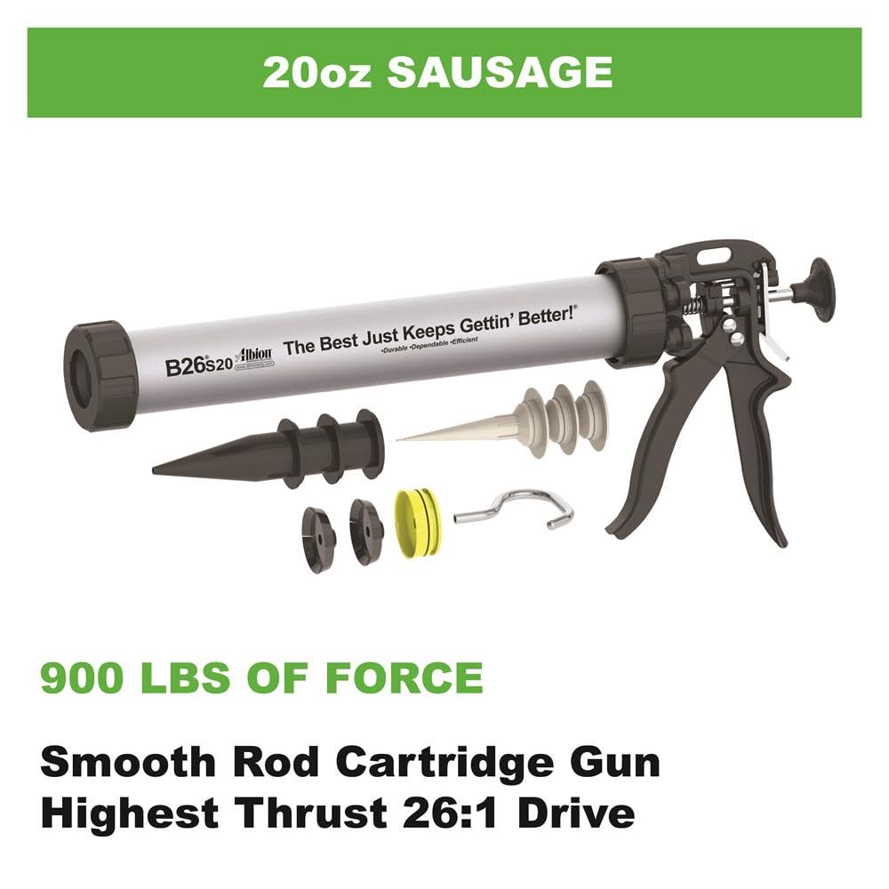 This Albion B26S20 is a 26:1 thrust 20 oz manual drive sausage caulking gun with an aluminum barrel. Albion Engineering is an internationally recognized leader in dispensing technologies, providing high-quality tools for various applications.