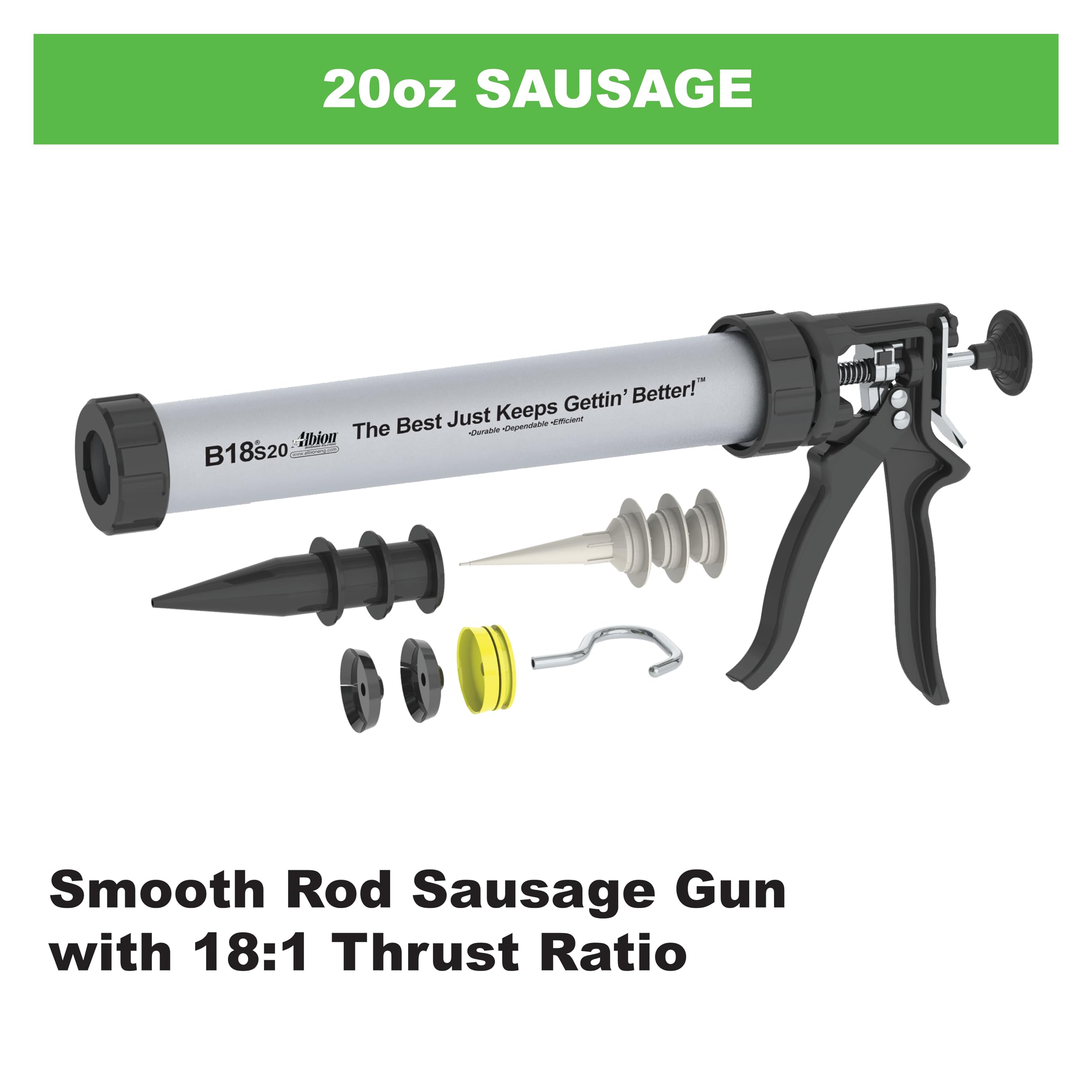 This Albion B18S20 is an 18:1 thrust 20 oz smooth action manual drive sausage adhesive caulking gun. The barrel is made of aluminum and 2″ in diameter. Albion Engineering is a third-generation company internationally recognized as a leader in handheld dispensing technologies. Albion supports multiple industries with innovative, high-quality dispensing tools and accessories for the most demanding applications.