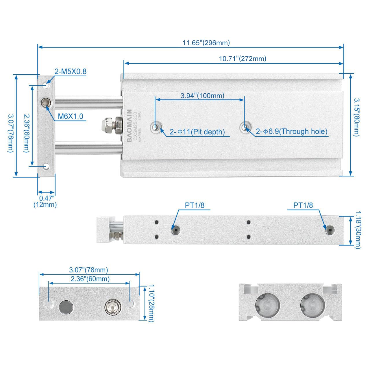 Baomain Dual Rod Pneumatic Air Cylinder