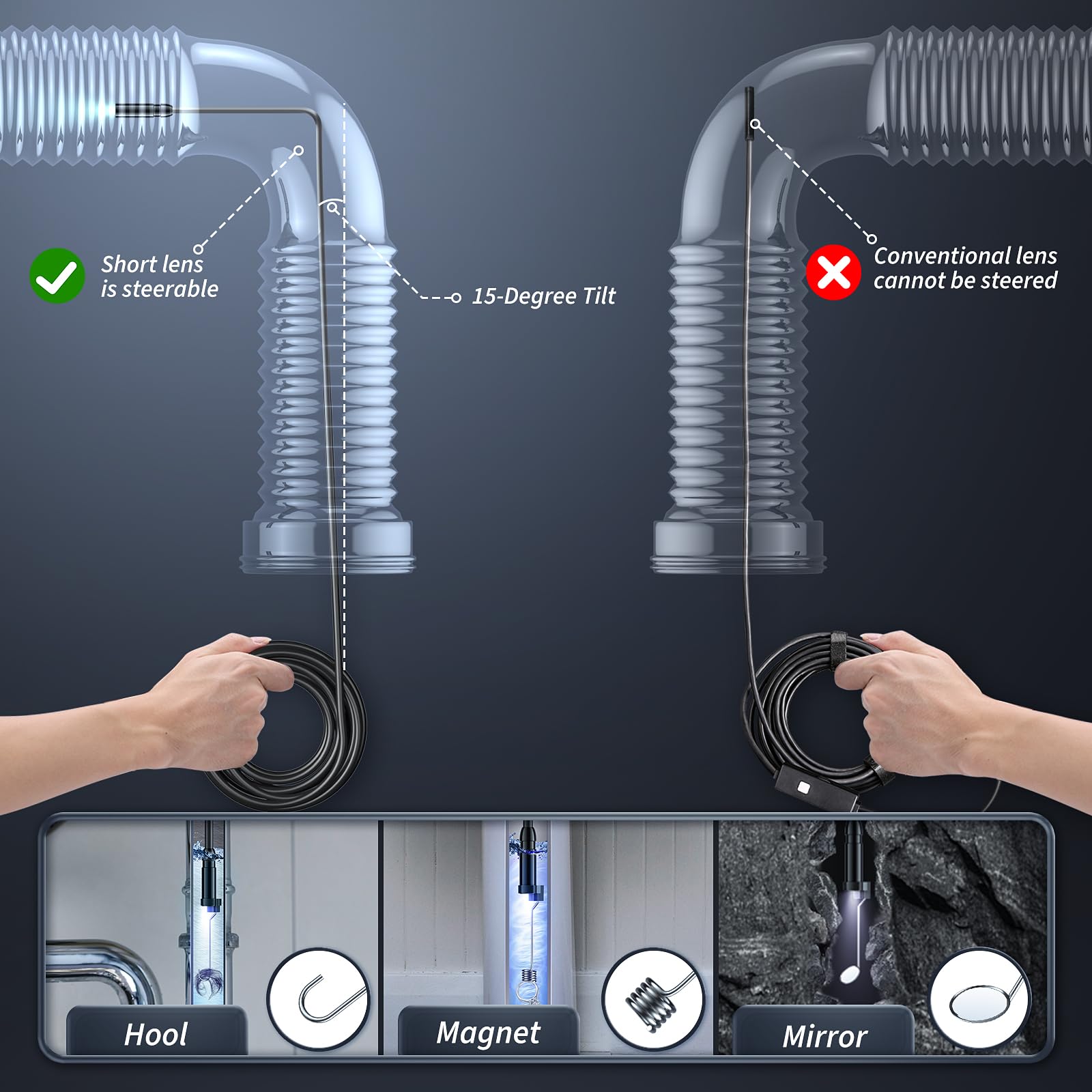This snake camera is equipped with 8 LED auxiliary lighting small diameter HD camera, adjustable brightness. The camera uses a high-sensitivity chip, working well in dark environments. Bore scope camera probe is IP67 waterproof, suitable for wet and underwater environments.
