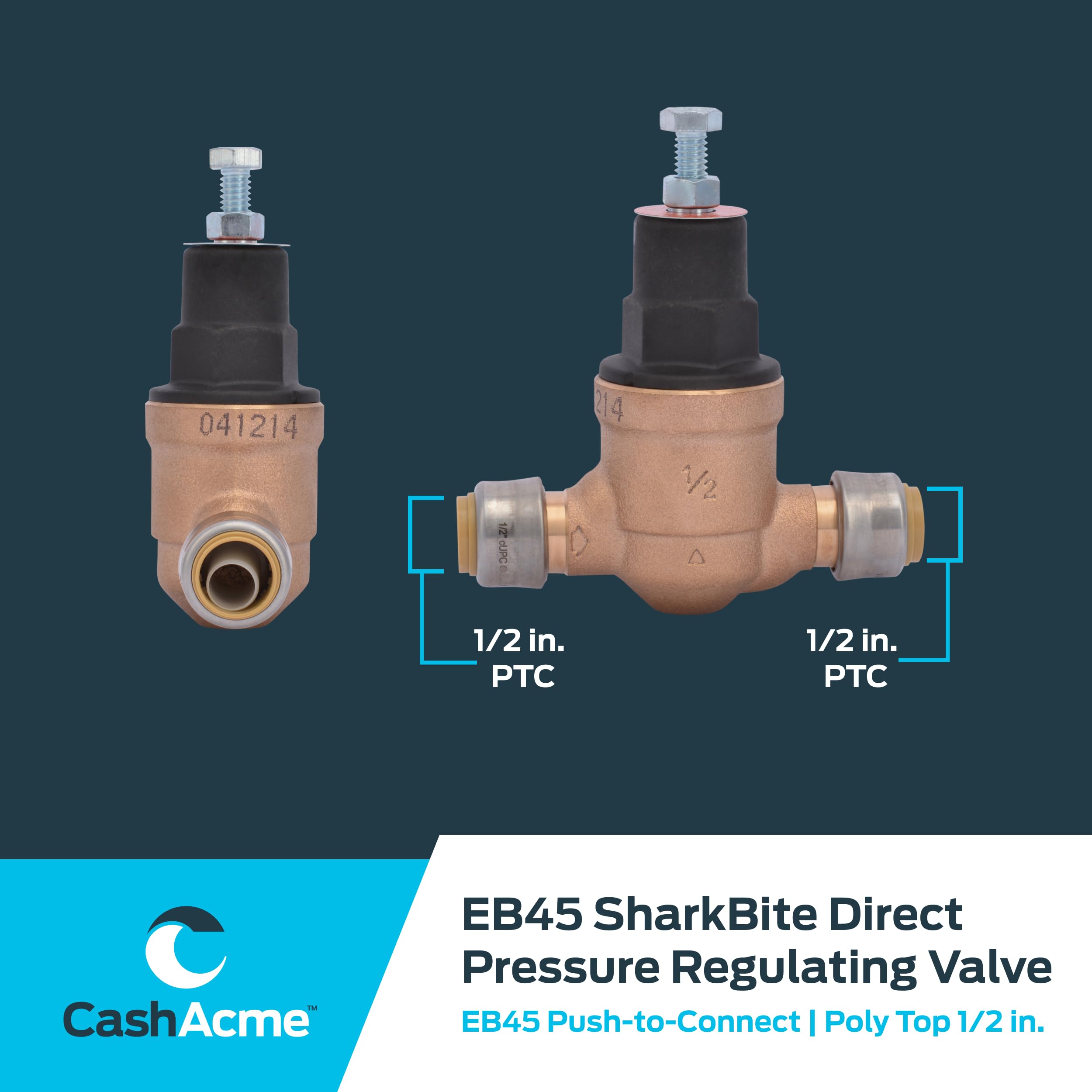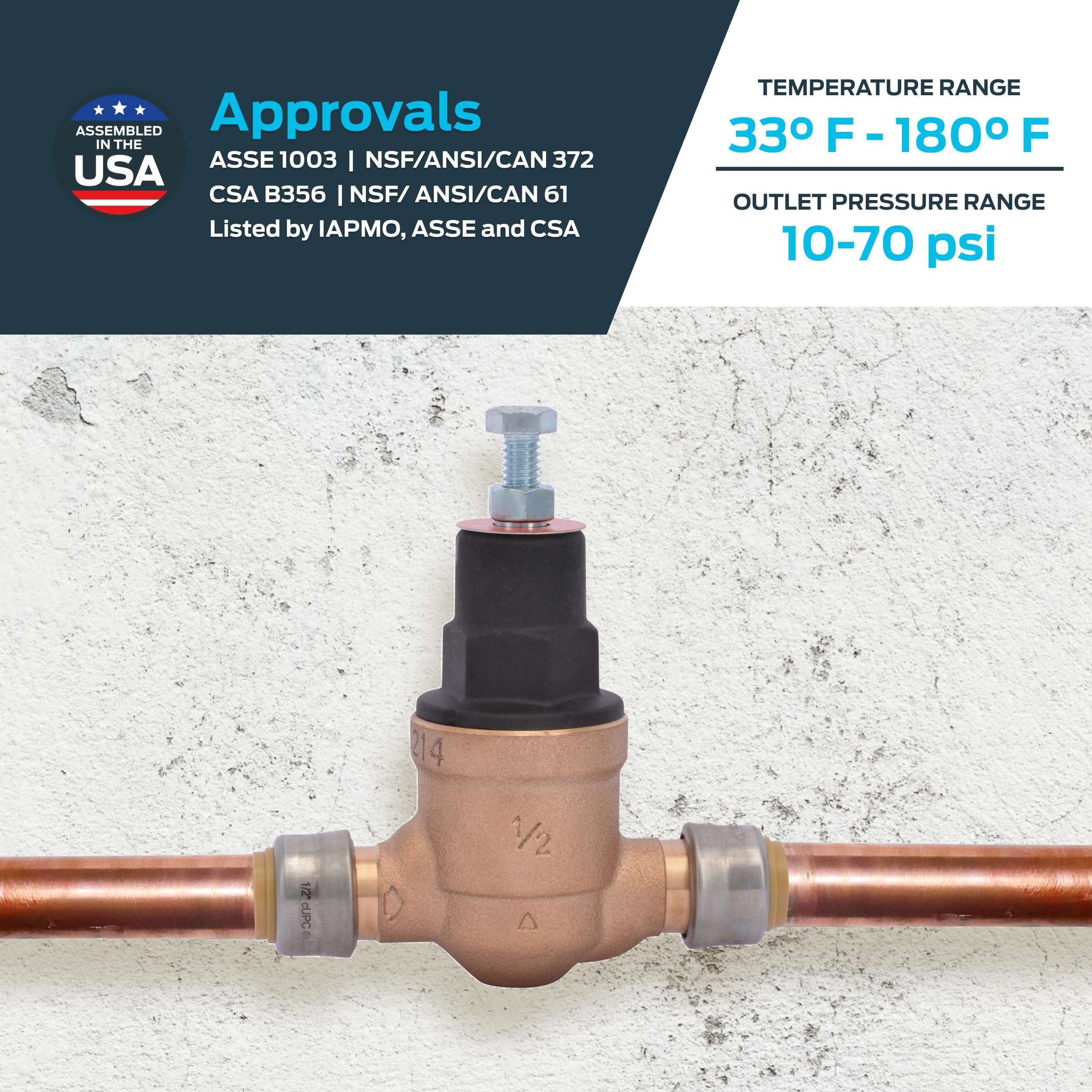 Keep water pressure regulated in any setting with this direct pressure valve. Designed to prevent surges and maintain consistent flow, this valve features a tamper-resistant EB45 design. The push-to-connect mechanism allows for quick installation with a secured seal. Made from lead-free brass and adjustable from 10 to 70 PSI, supporting hot and cold water up to 180°F.