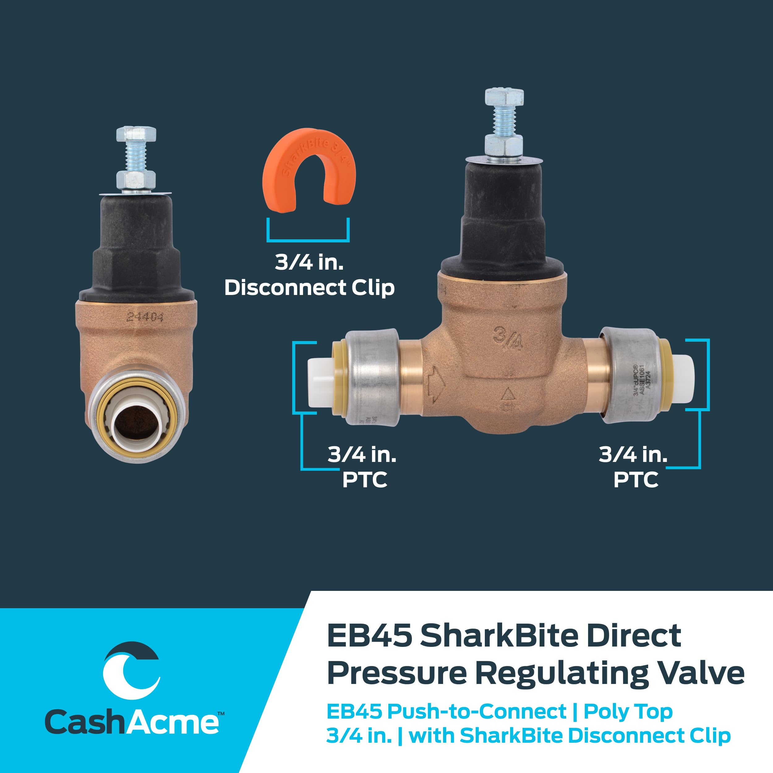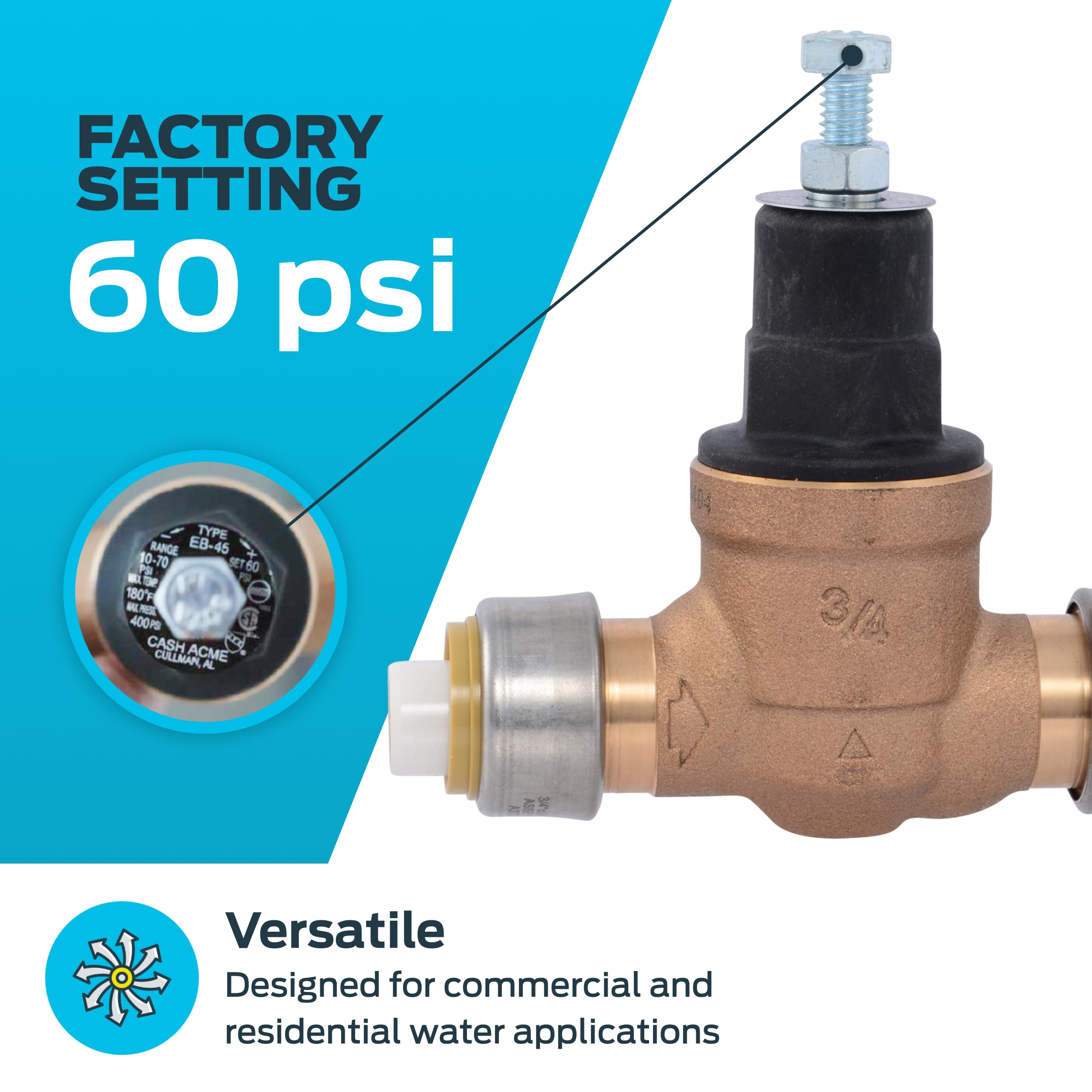Regulate water pressure efficiently with the Cash Acme EB45 SharkBite Pressure Regulating Valve. This valve features a tamper-resistant design for precise pressure control and tool-free installation. Made from lead-free brass, stainless steel, and durable polymer components, it supports both hot and cold water up to 180°F, adjustable from 10 to 70 PSI.