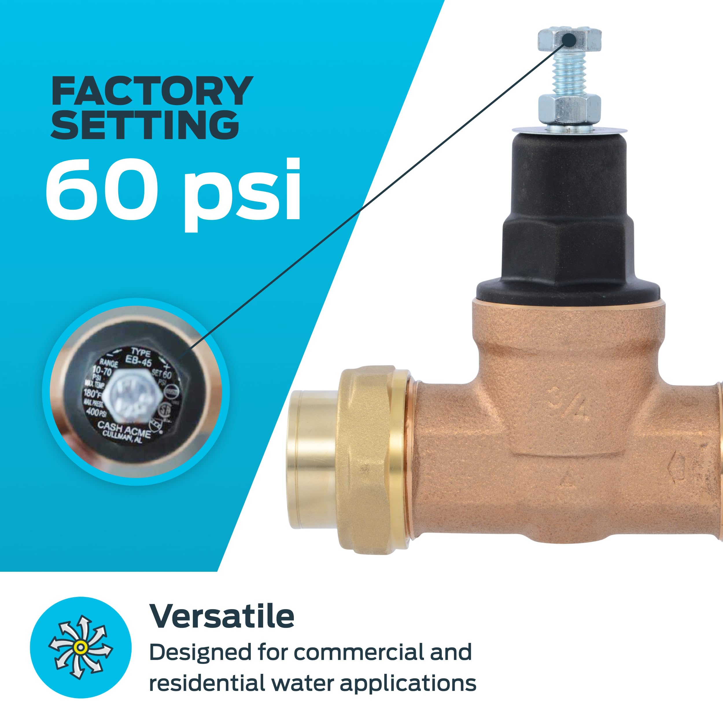 Keep water pressure regulated in any setting with this direct pressure regulating valve. Lock in desired pressure with the tamper-resistant EB45 design. Quick, tool-free installation with durable brass construction. Rated to 60 PSI, adjustable from 10 to 70 PSI, and suitable for hot and cold water up to 180°F.