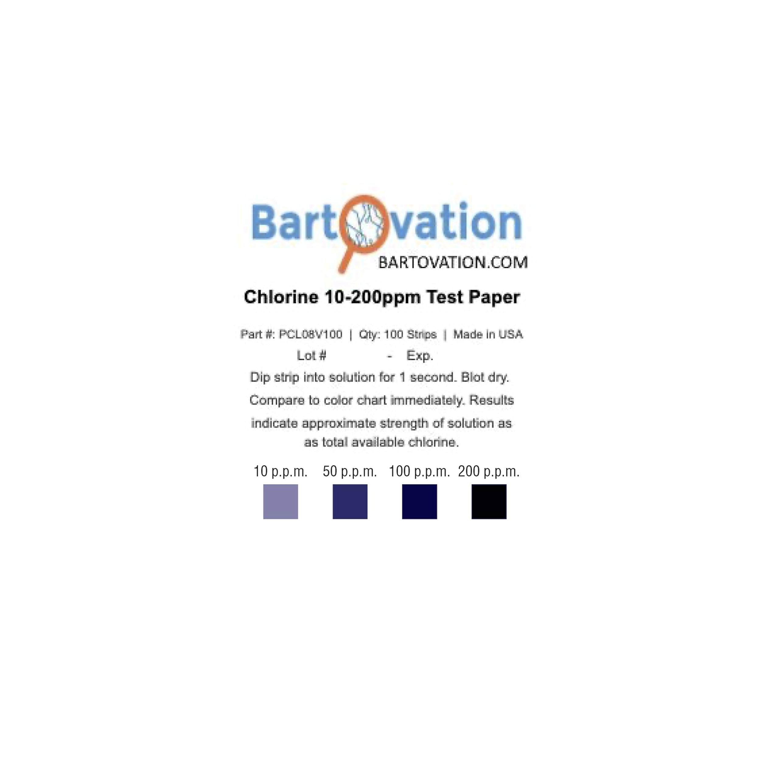 About Bartovation From our headquarters in Queens, New York and with the help of our distributor network, we service customers all around the globe. We specialize in the production and distribution of testing strips for virtually every application. We value every one of our customers and strive to make them happy and satisfied. This product is proudly Made in America For Restaurant Sanitizer Testing This Chlorine Test Paper provides a simple, reliable, and economical means to measure the concentration of chlorine in sanitizing solutions. The Chlorine Test Paper measures total available chlorine from 10-200ppm and gives results in just seconds. Our chlorine test paper is most often used to test the strength of solutions used to sanitize surfaces, for example, in the restaurant industry. In these types of applications, bleach is usually used to generate the available chlorine. Perfect for testing chlorine / bleach sanitizers and avoiding hefty board of health fines! Three pocket sized, splash proof, lightweight vial protecting instructions and color chart with 300 total strips Rapid, easy to use one second test Tests in a range of 10-200 ppm (10, 50, 100 and 200 ppm markings) These are NOT for pool OR tap water tests. They ARE designed specifically for restaurants testing their chlorine sanitizers in 3 part sinks