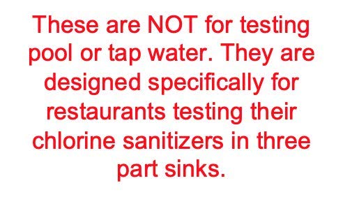 Commercial Kitchens This strip is designed as an economical test for commercial dishwashing and three part sinks. It absolutely will not work for testing undiluted chlorine/bleach or Quaternary Sanitizers. Each vial has an expiry date and lot number printed on it to make even the most strict inspector happy! NOT Tap or Drinking Water This test will NOT work for testing tap or drinking water. You need a residual chlorine test for this. If you were to try to use this test for tap water you would not get a reading. NOT Pools or Hot Tubs This test will NOT work for testing pools or hot tubs. You need a residual chlorine test for this. If you were to try to use this test for tap water you would not get a reading.