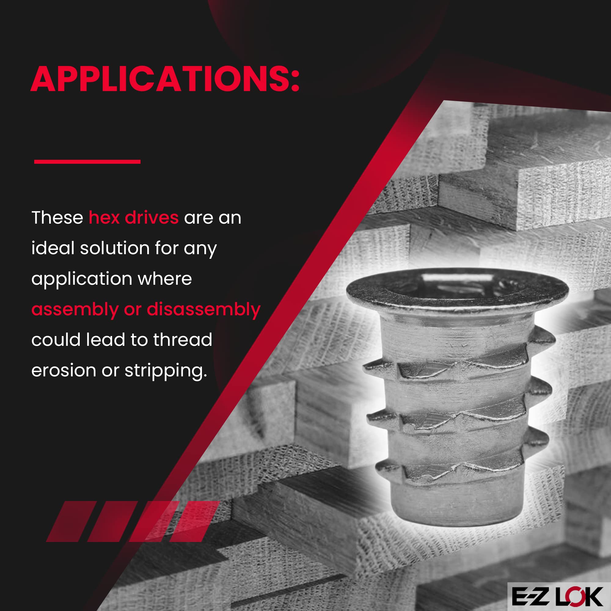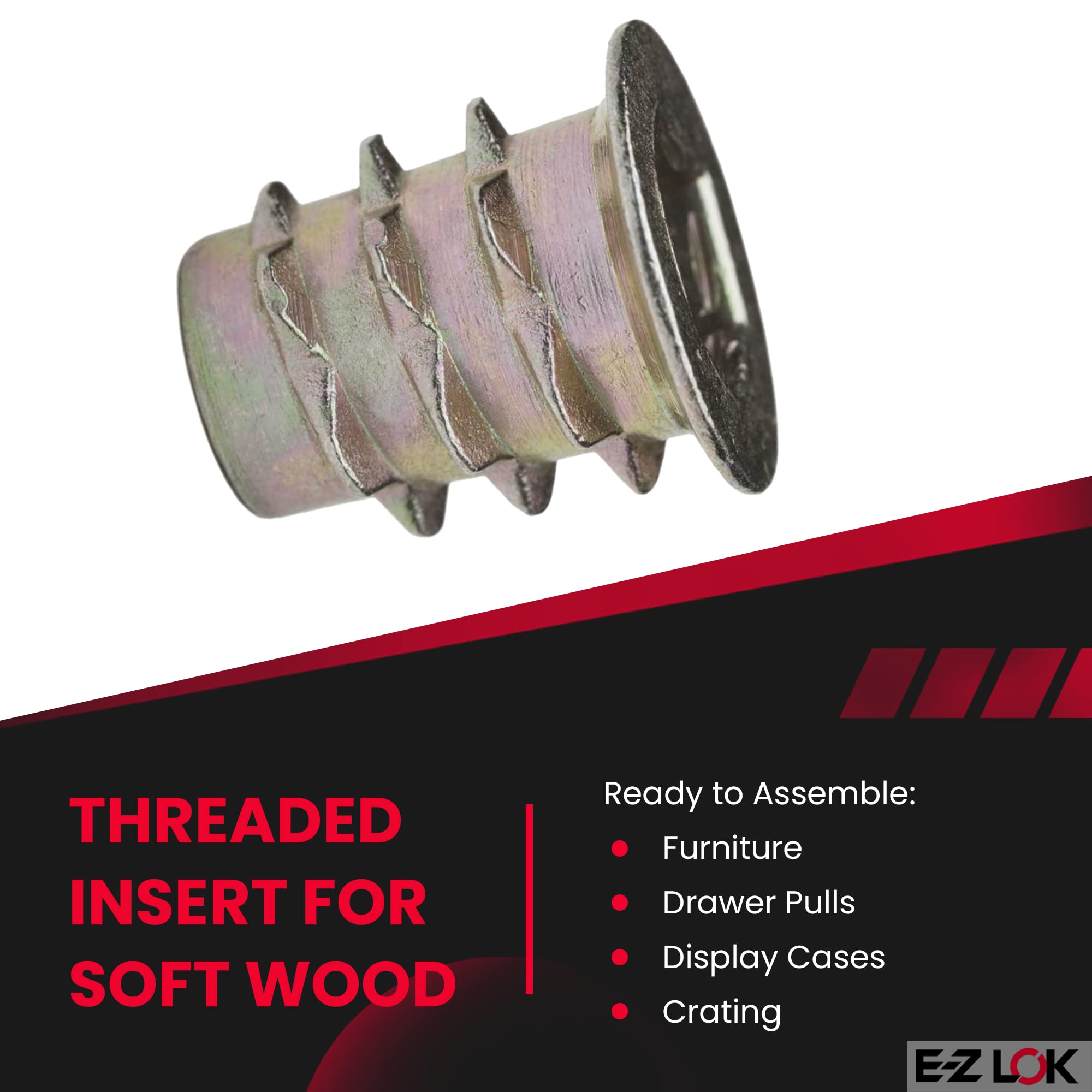 E-Z LOK Threaded Inserts for Soft Wood: Ideal for reinforcing threads in soft woods like pine, composition board, and plywood. Easy installation with an Allen wrench or drive tool. Zinc thread inserts available in hex designs for various internal threads.