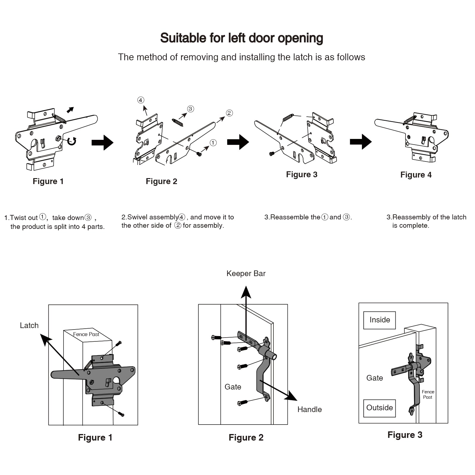 1. Mark screw holes on fence post for latch placement and tighten screws. 2. Install keeper bar aligned with latch lock hole, mark and tighten screws. 3. Place handle on keeper bar, mark screw holes, and tighten screws. Refer to figure 3 for completion.