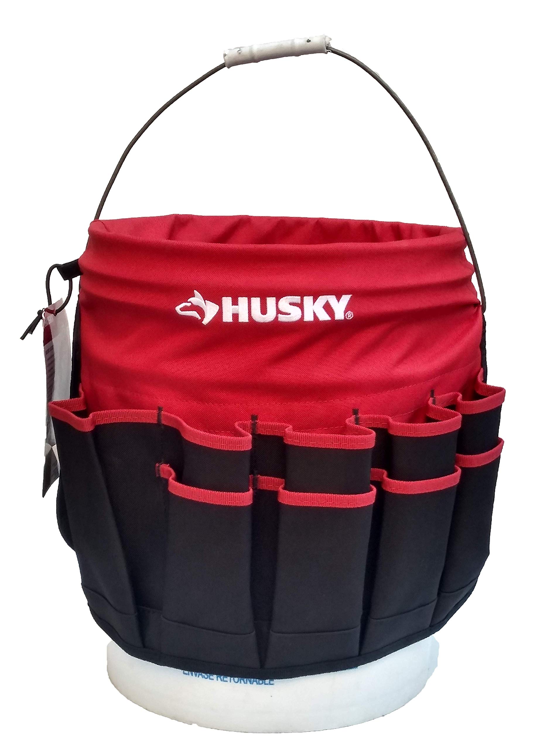 Get efficient and easy storage with the Husky Bucket Jockey. Constructed of 600 denier water-resistant material, this innovative design features deeper pockets for versatile tool and accessory storage. Pair with the Home Depot Homer Bucket and the Husky 12 in. Storage Seat for the ultimate toolbox solution. Equipped with a total of 30 pockets for optimal storage, it fits most 5-gallon buckets (sold separately). Tools and accessories not included.