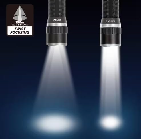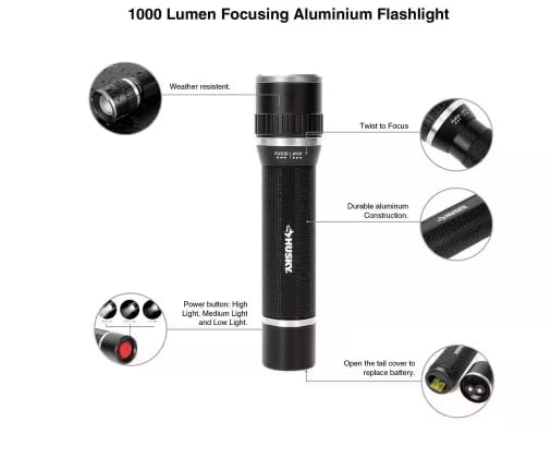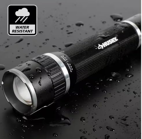 The Husky 1000-Lumens focusing aluminum flashlight features a pocket clip for easy access and a twist focus from spot to flood beam, providing full control over beam size. Easily change the light beam width from narrow to wide with a simple twist. This flashlight is powered by 4 AAA alkaline batteries (included), offering high impact resistance, weather resistance, and virtually unbreakable construction. It has three modes: High – 1000-Lumens / 1.5 hours run time / 150m throw; Medium – 300-Lumens / 5 hours run time / 80m throw; Low – 100-Lumens / 15 hours run time / 50m throw.