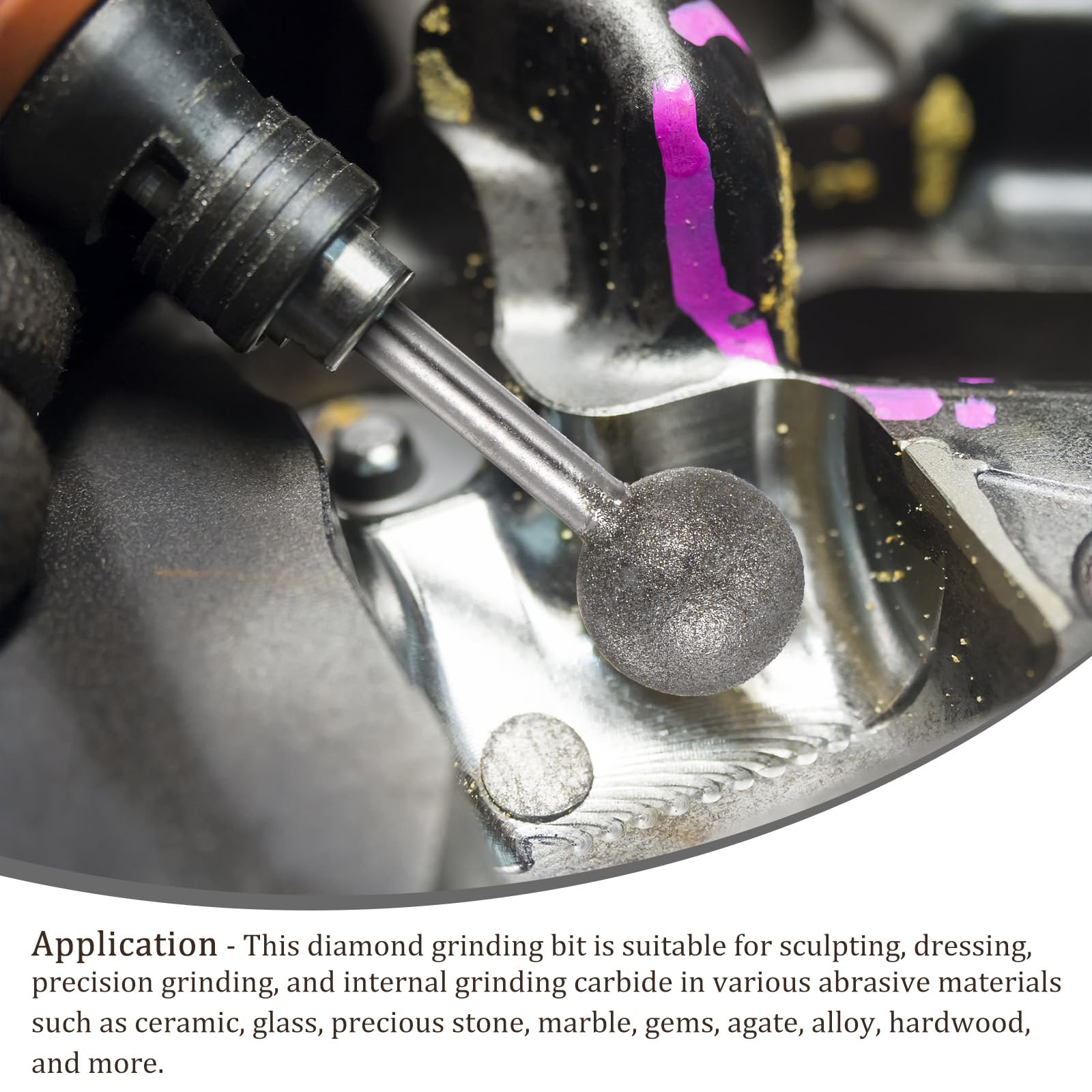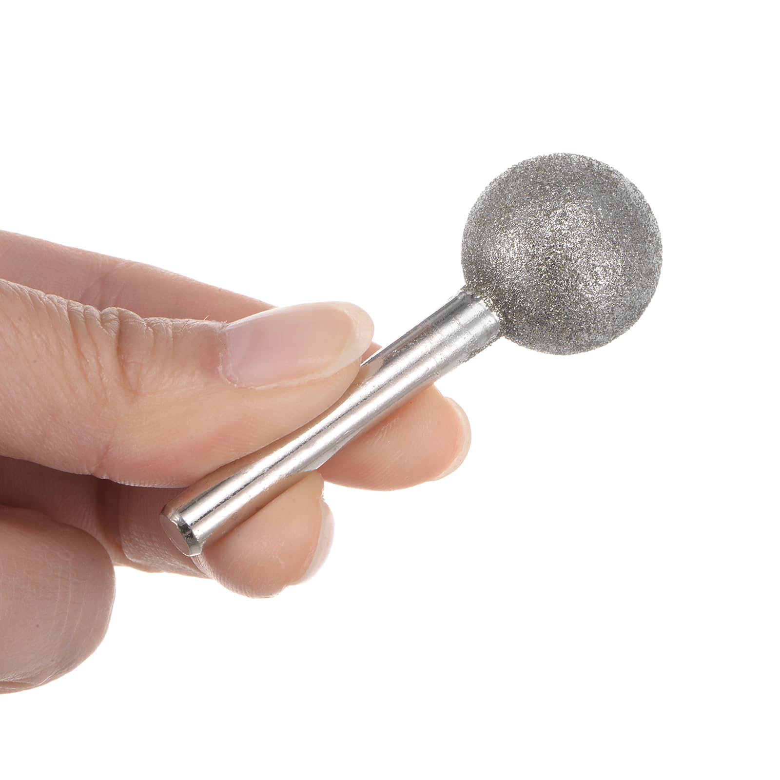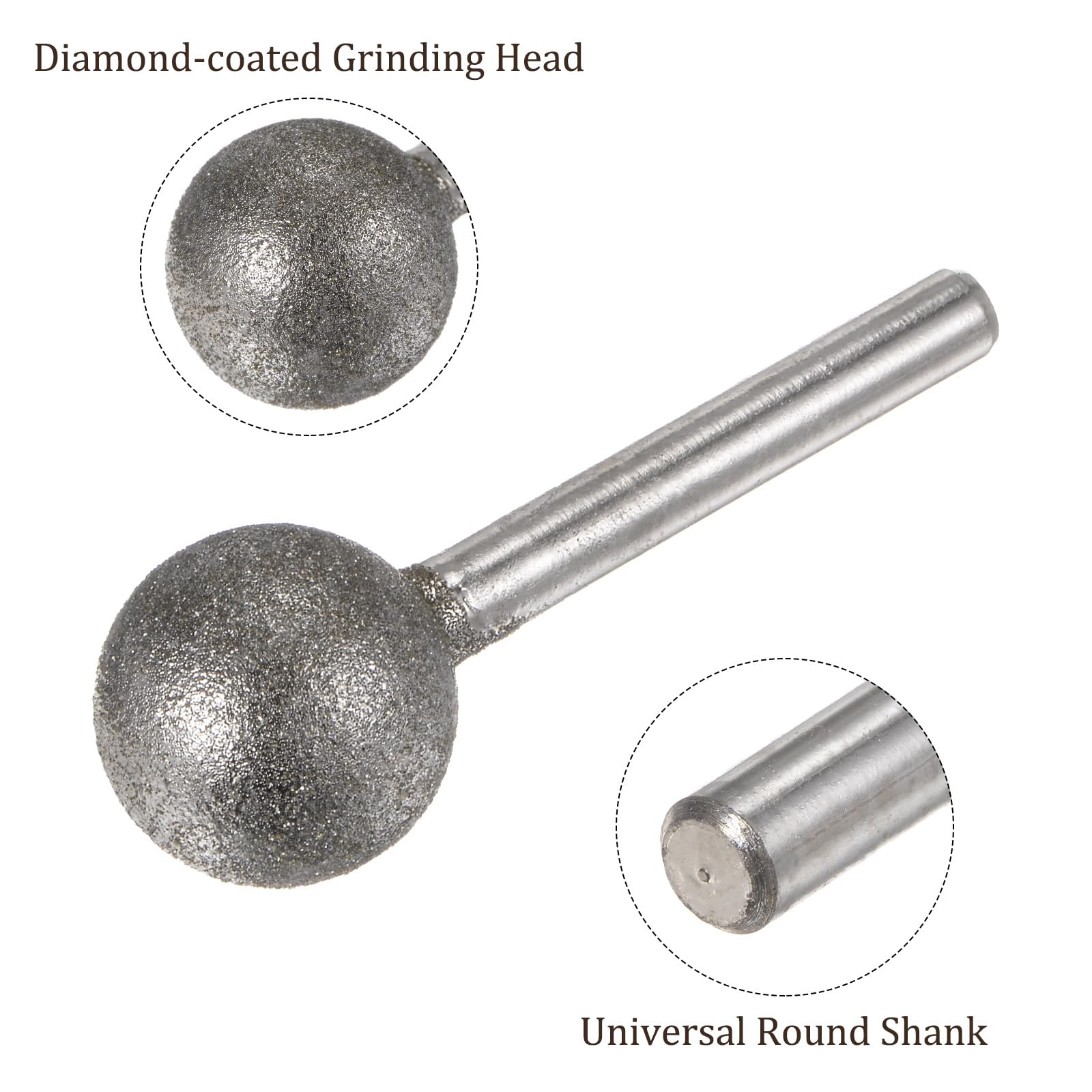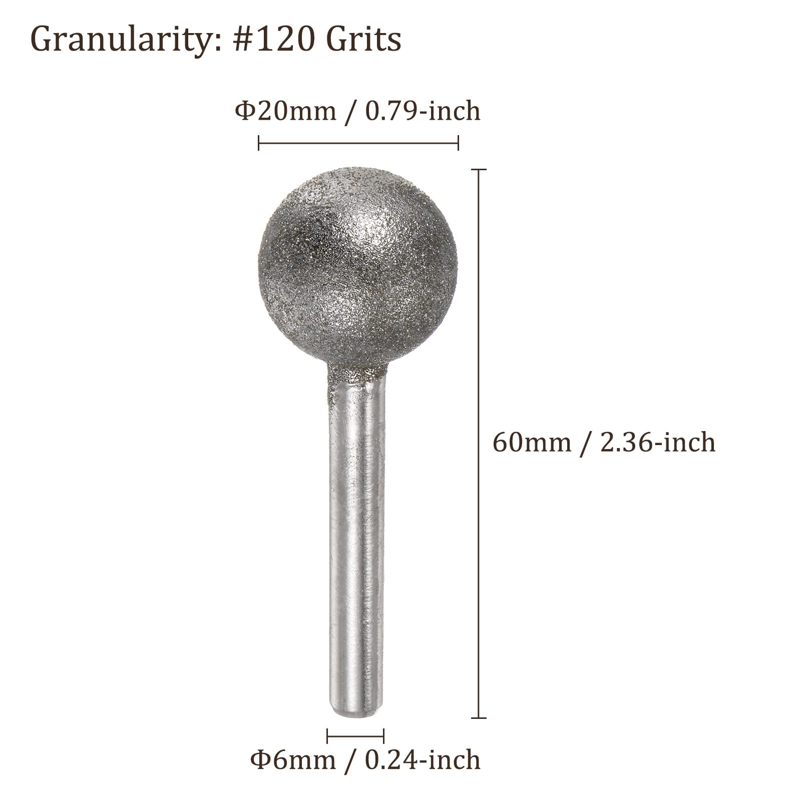 Application This diamond grinding bit is ideal for sculpting, dressing, precision grinding, and internal grinding carbide in various abrasive materials like ceramic, glass, precious stone, and more. It’s perfect for polishing and engraving glass, hardwood, marble, stone, ceramics, gems, and even metals like iron and silver. About This Product -High working efficiency thanks to the sturdy metal shank and diamond-coated grinding head. -Ideal for precious stone jade carving, mold repairing, rust polishing, and DIY hobbyists. -The round shank fits most electronic grinders, engraving machines, hanging mills, and hand electric drills. Specification Material: Carbon Steel Granularity: #120 Grits Head Diameter: 20mm / 0.79″ Shank Size: 6mm / 0.24″ (D) Total Length: 60mm / 2.36″ Tips -Use caution to prevent flying chips. -Wear safety goggles or protective eyewear during use to protect your eyes.
