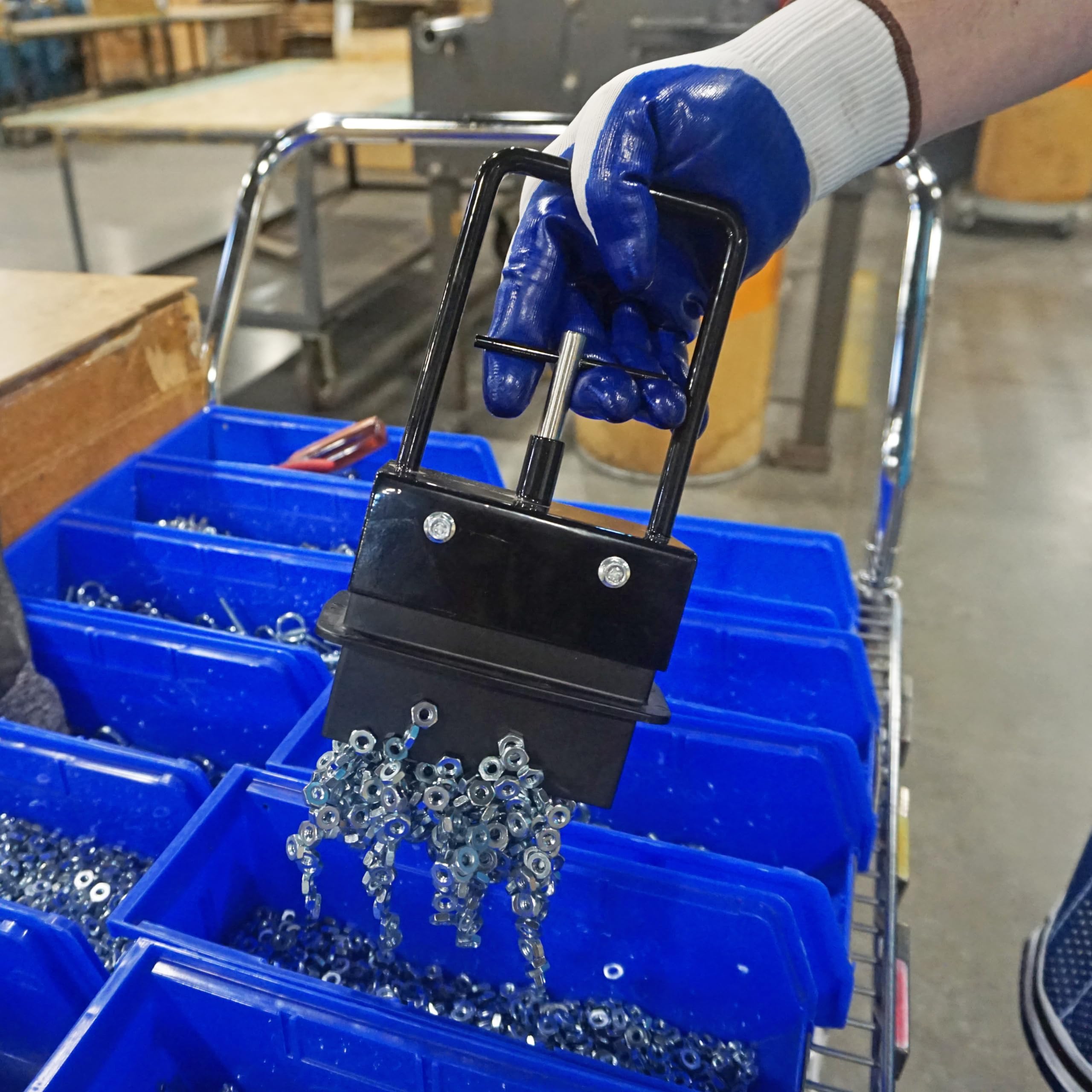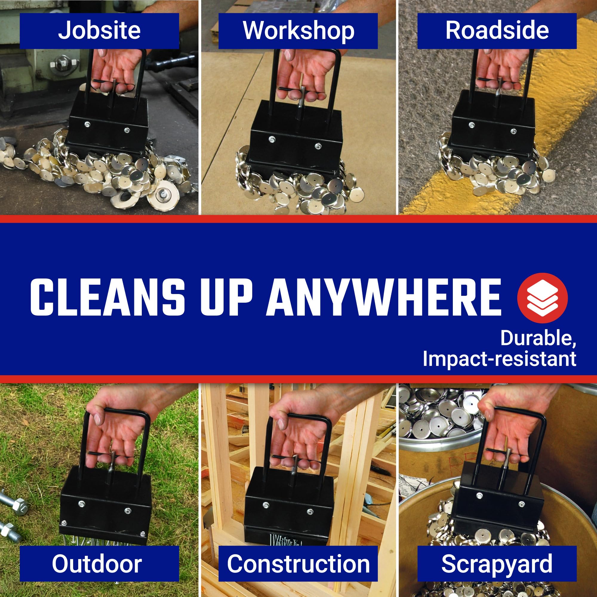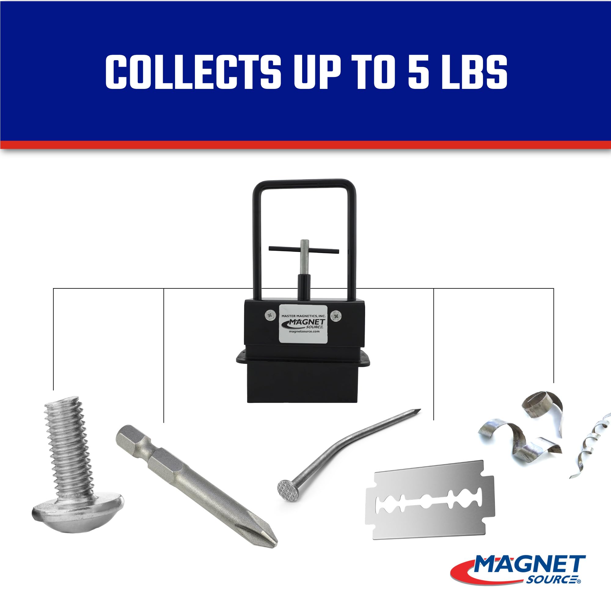 The Master Magnetics Parts Lifter is a hand-held magnet that attracts and holds up to 5 lbs of ferrous metal pieces. Easily transfer bulk metal pieces, including nails, screws, nuts, washers, and eyebolts, to your desired location. Release scrap iron with one hand by lifting the T-shaped handle with your fingertips. The magnet assembly is covered with a durable steel plate, and the handle and release handle are also steel. Impact-resistant hard plastic is used on the sides and bottom of the magnet assembly.