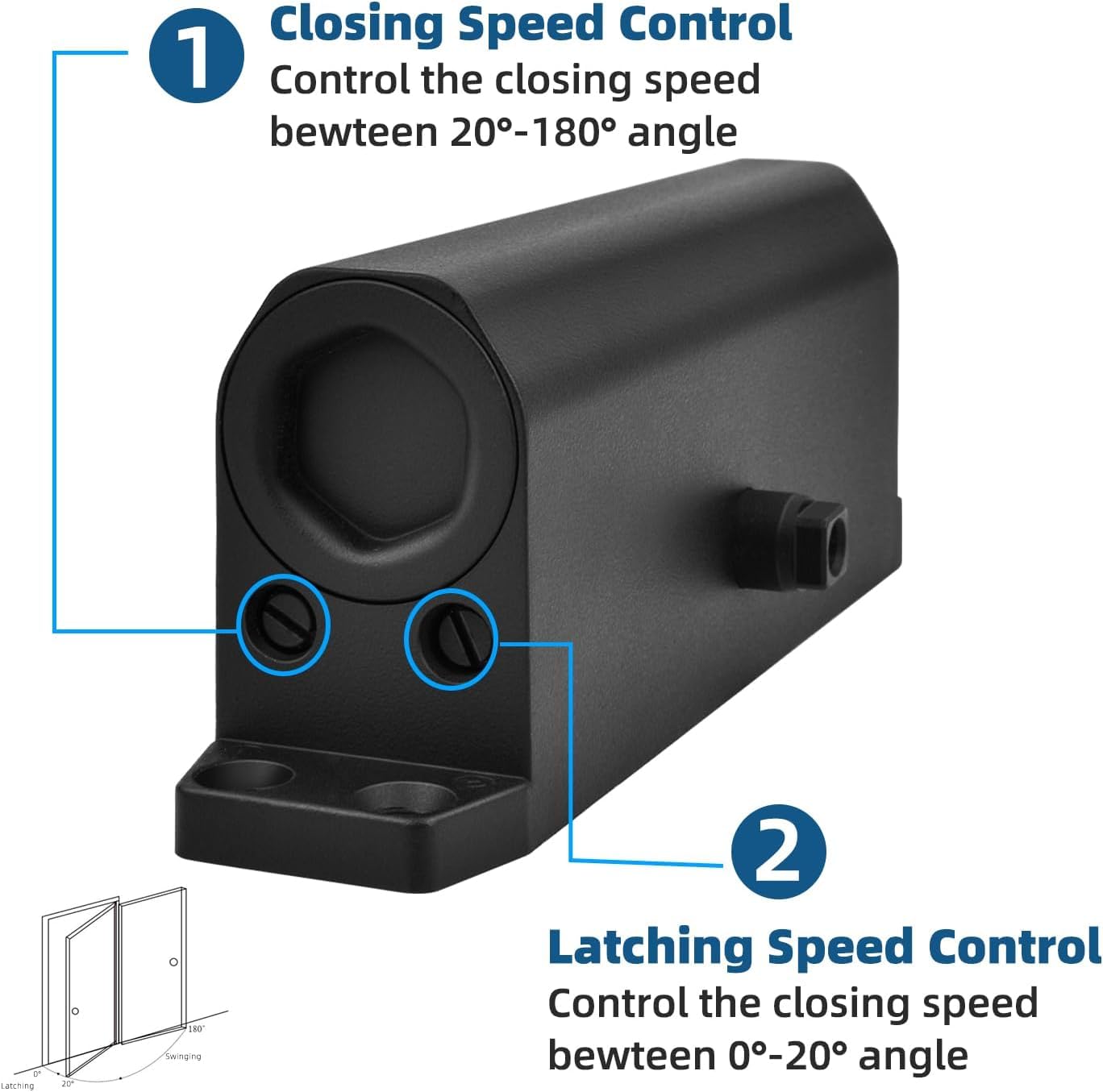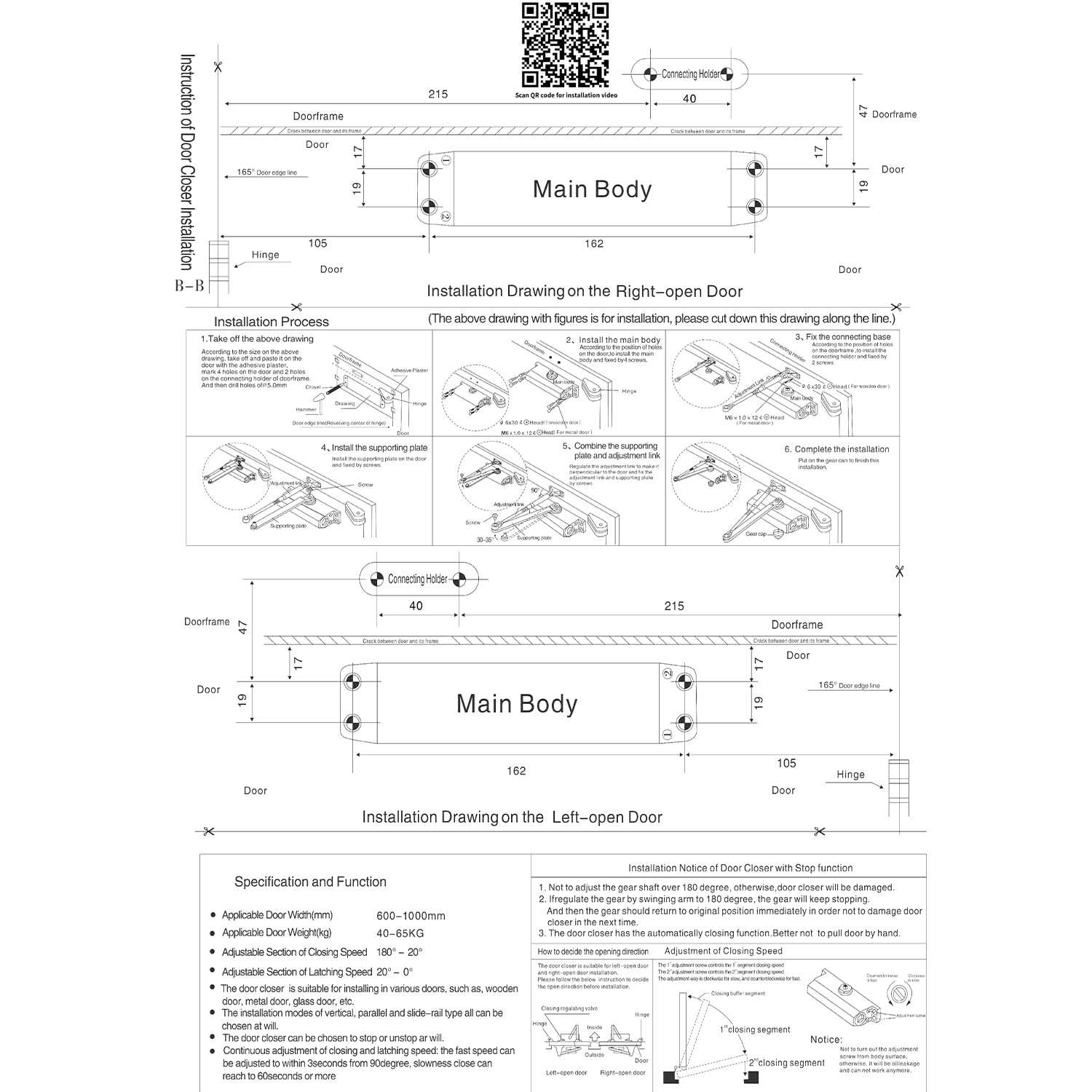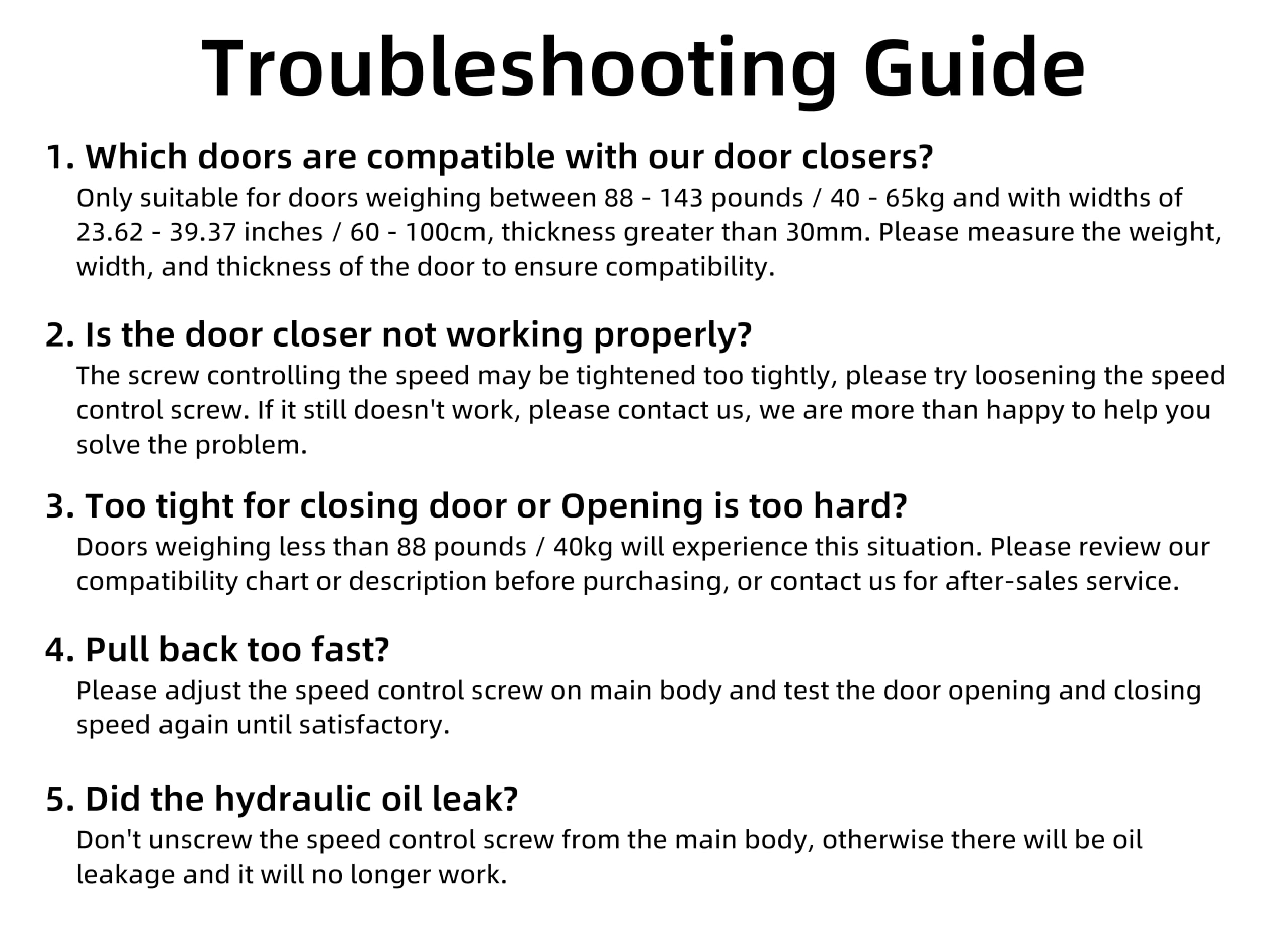 Door Closer Size: Main Body Length: 6.9′ / 17.5cm, Width: 1.5′ / 3.9cm Height: 2.4′ / 6.1cm, Door Closer Arm: 9.4′ / 24cm. Please measure the weight, width, and thickness of your door before purchasing to ensure compatibility. Which doors are compatible with our door closers? Only suitable for doors weighing between 88 – 143 pounds / 40 – 65kg and with widths of 23.62 – 39.37 inches / 60 – 100cm, thickness greater than 30mm. Please measure your door thickness and required size before purchasing to ensure compatibility. Is the door closer not working properly? The screw controlling the speed may be tightened too tightly, please try loosening the speed control screw. If it still doesn’t work, we are more than happy to help you solve the problem. Did the hydraulic oil leak? Not to turn out the speed control screw from main body,otherwise, it will be oilleakageand can not work anymore. Pull back too fast? Please adjust the speed control screw and test the door opening and closing speed again until satisfactory.