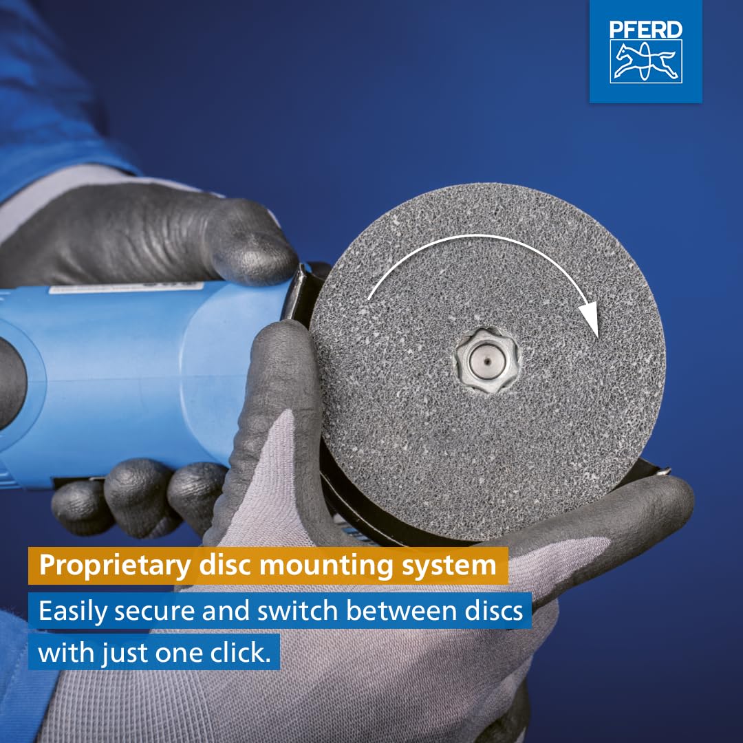 The patented COMBICLICK system allows for very flat applications, preventing scratches from protruding clamping parts and ensuring high abrasive utilization. Ideal for surface finishing from coarse to mirror polishing, this system supports a wide range of tools for various surface processing tasks, offering efficiencies in sanding and polishing. Advantages include a quick-clamping system for easy handling, cool grinding, and cost-effective tool changes, providing soft and flexible sanding for face applications with fiber discs in 4-1/2″ and 5″ sizes.