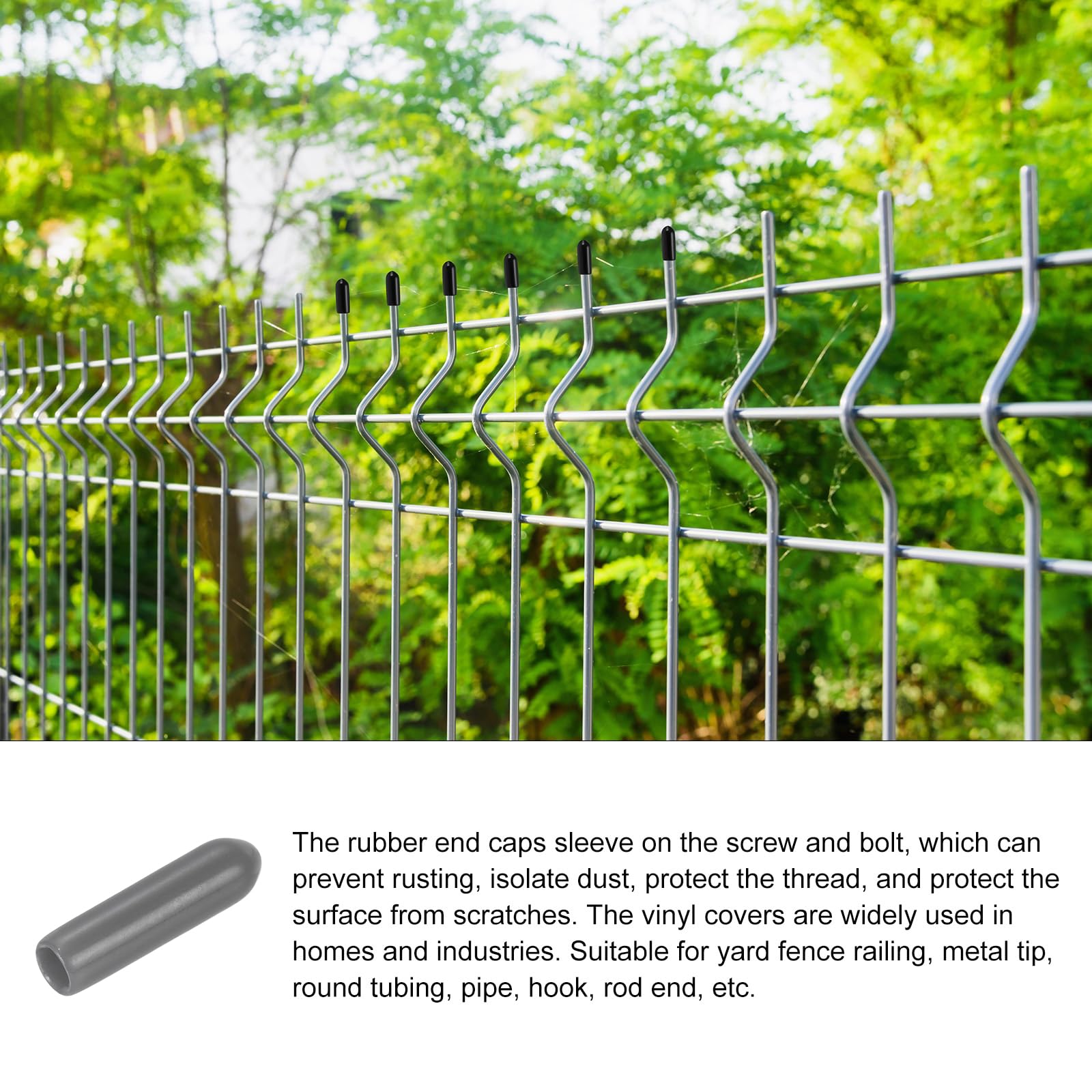 The rubber end caps sleeve on screws and bolts to prevent rust, isolate dust, protect threads, and surfaces from scratches. Versatile vinyl covers for home and industrial use. Suitable for various applications like yard fence railing, round tubing, and more. Made of soft, wear-resistant rubber with good elasticity. Provides insulation and can be used in electrical applications. Please confirm the correct size before ordering.