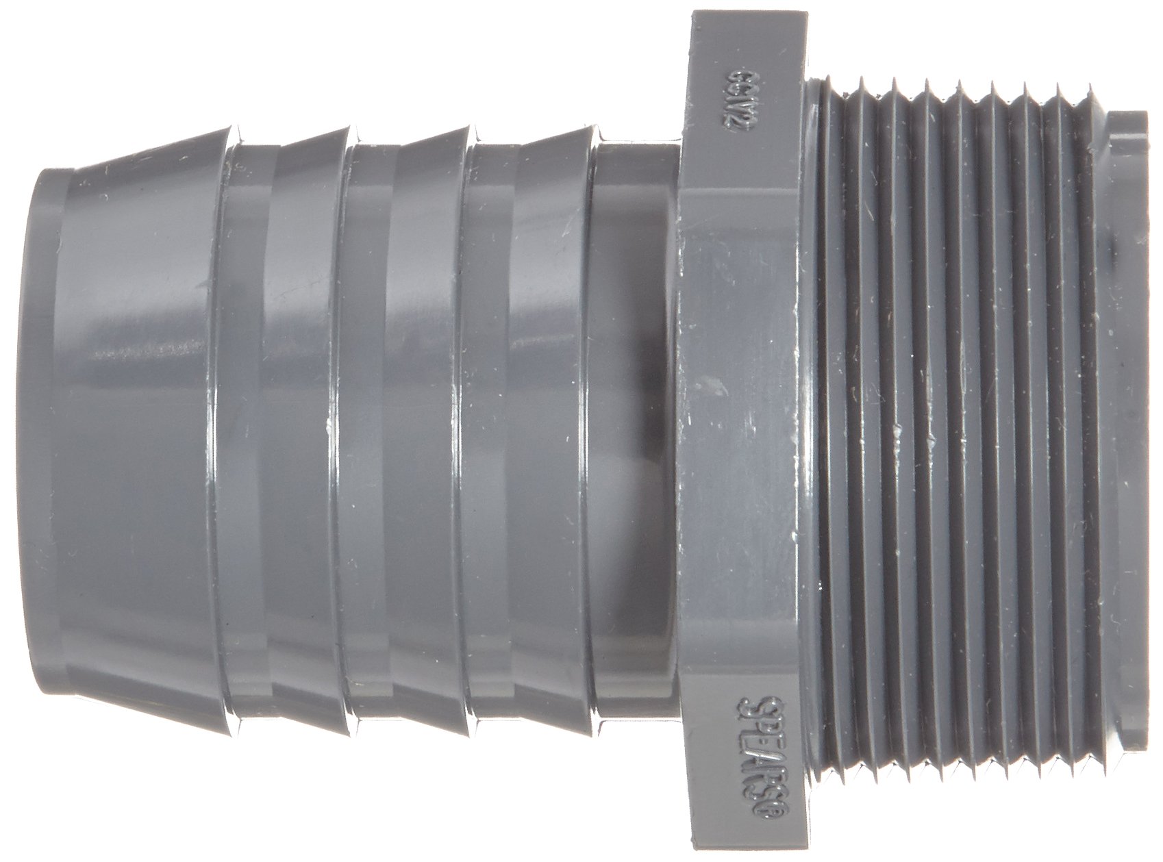 This Spears 1436 series tube fitting is made of gray polyvinyl chloride (PVC) plastic and features a male National Pipe Thread (NPT) on one end and a barbed insert on the other for connecting to ASTM International schedule 40 polyethylene (PE) piping in a straight run. The adapter creates a tight seal on PE pipe when used with a hose clamp (sold separately). With a max working pressure dependent on the pipe, and a max temp of 140°F, this fitting resists reactions with acids, gasoline, alcohol, and hydrocarbons. This male barb tube fitting meets ASTM D2609 standards for plastic insert fittings, ASTM schedule 40 standards for wall thickness, and is NSF International 61 certified for potable water use.