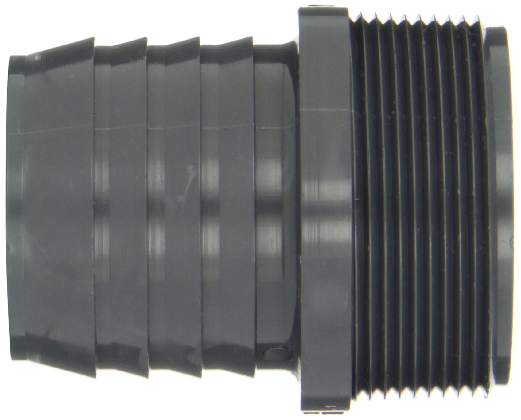 This Spears PVC tube fitting is made of gray polyvinyl chloride (PVC) plastic and features NPT male thread on one end and a barbed insert on the other for connecting to ASTM International schedule 40 polyethylene (PE) pipe. The adapter ensures a tight seal on flexible PE pipe when used with a hose clamp. With a maximum working pressure dependent on the PE pipe, a maximum temperature of 140°F, and resistance to various substances, this fitting meets ASTM D2609 standards and NSF International 61 certification.