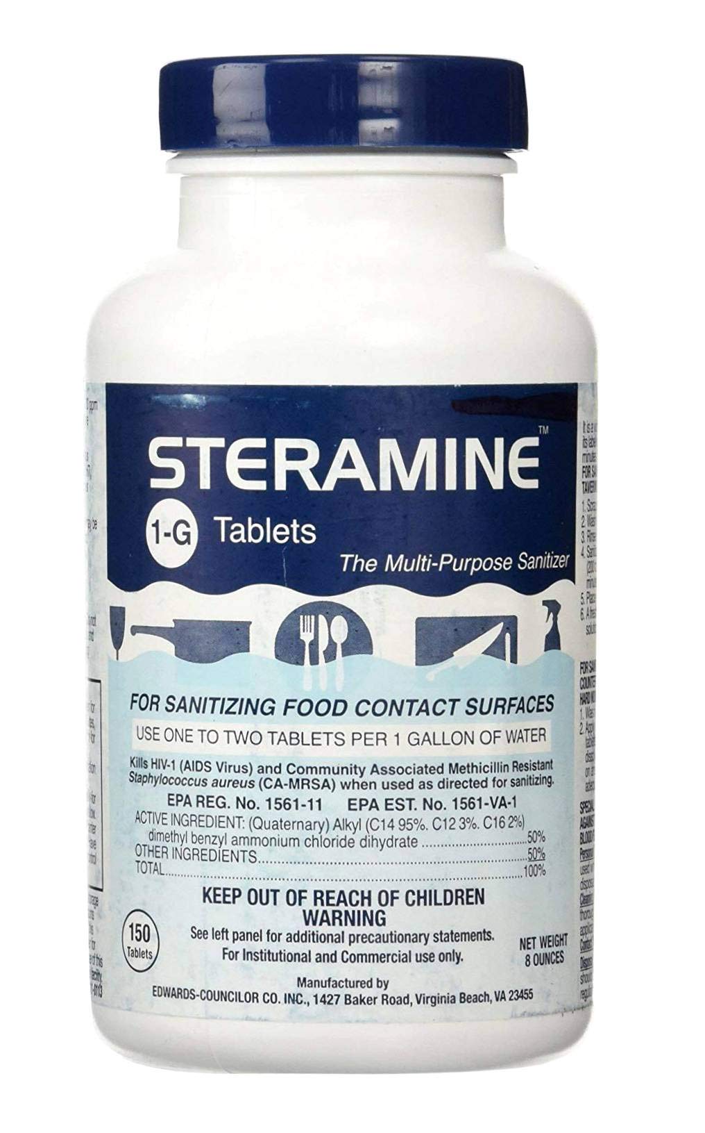 CONCENTRATED SANITIZER TABLETS – Box of 6 x Bottles of Steramine 1-G Quaternary Tablets Multi-Purpose Sanitizer. Sanitizes surfaces in restaurants, bars, gyms, schools and more. Pre-measured and easy to use. Economical and super concentrated. Used worldwide by the Bar & Restaurant Industry.