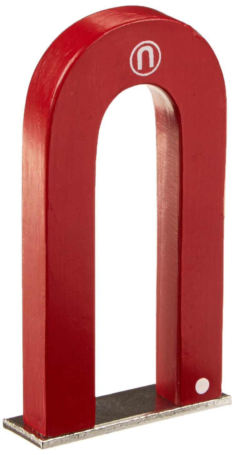 Powerful 3″ tall U-shaped alnico magnet painted red with keeper. North pole marked with dot.