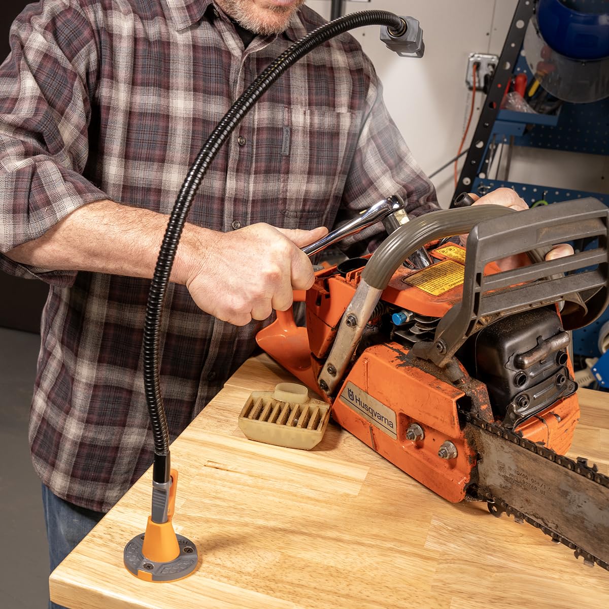 Illuminate your workspace with the 180-lumen rechargeable work light, use the 5-inch dual-level magnifying glass for intricate work, and keep your cell phone hands-free with the holder.
